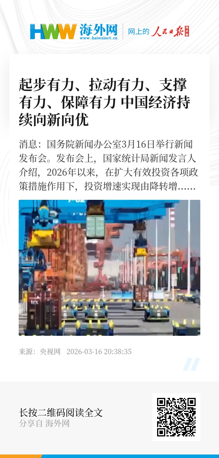 央视网消息:国务院新闻办公室3月16日举行新闻发布会。发布会上,国家统计局新闻发言人介绍,2026年以来,在扩大有效投资各项政策措施作用下,投资增速实现由降转增,出现多个积极变化,为供给结构优化、市场需求扩大发挥了积极作用。