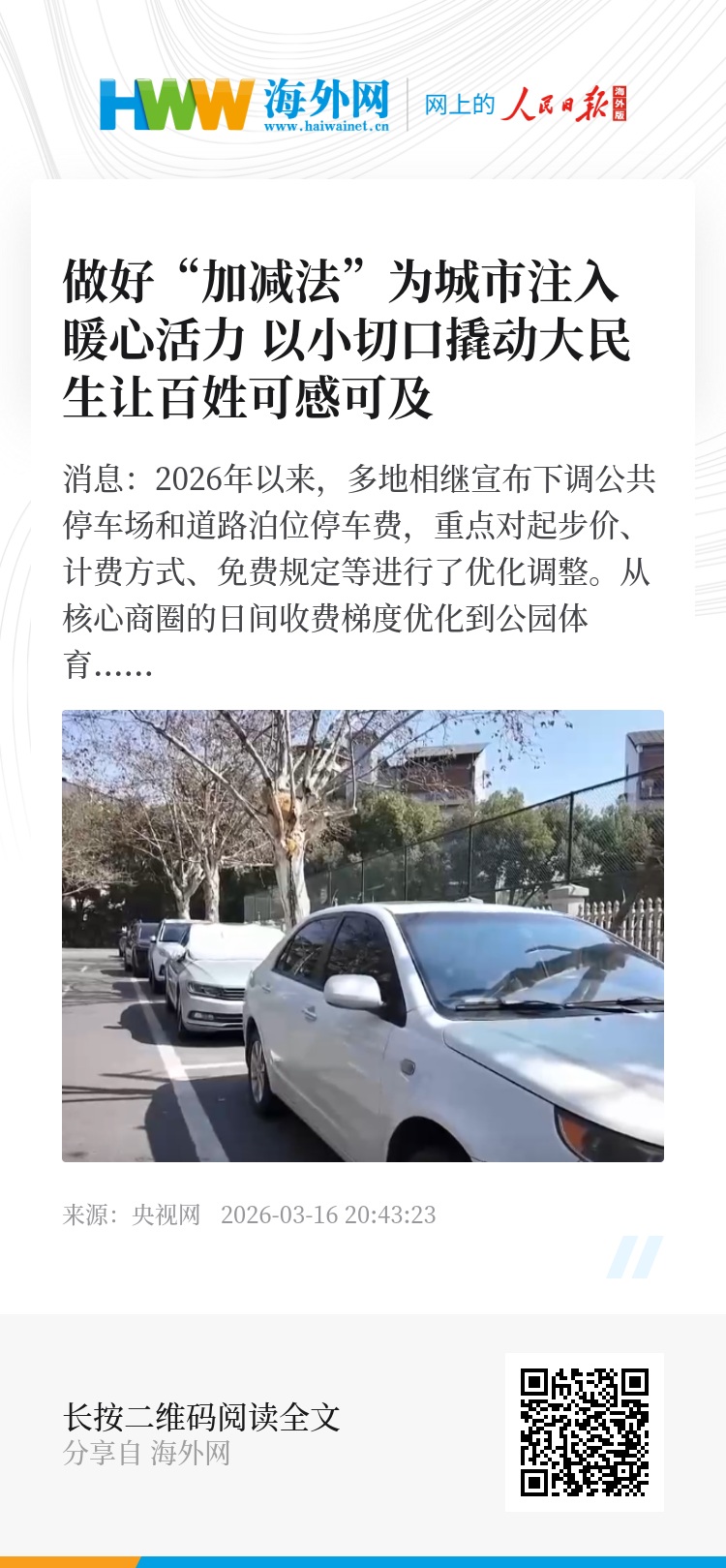 央视网消息:2026年以来,多地相继宣布下调公共停车场和道路泊位停车费,重点对起步价、计费方式、免费规定等进行了优化调整。从核心商圈的日间收费梯度优化到公园体育场馆的周末免费开放,直击“停车贵”痛点,为城市出行注入暖心活力。3月15日,湖北宜昌城区政府定价机动车停放服务收费政策正式实施。