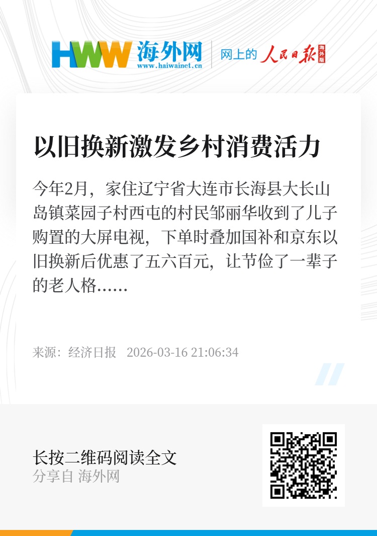 今年2月,家住辽宁省大连市长海县大长山岛镇菜园子村西屯的村民邹丽华收到了儿子购置的大屏电视,下单时叠加国补和京东以旧换新后优惠了五六百元,让节俭了一辈子的老人格外欣慰。
