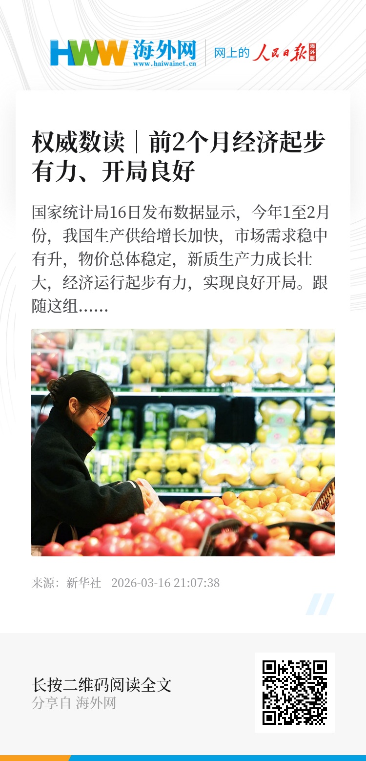 国家统计局16日发布数据显示,今年1至2月份,我国生产供给增长加快,市场需求稳中有升,物价总体稳定,新质生产力成长壮大,经济运行起步有力,实现良好开局。跟随这组海报,一起了解下。