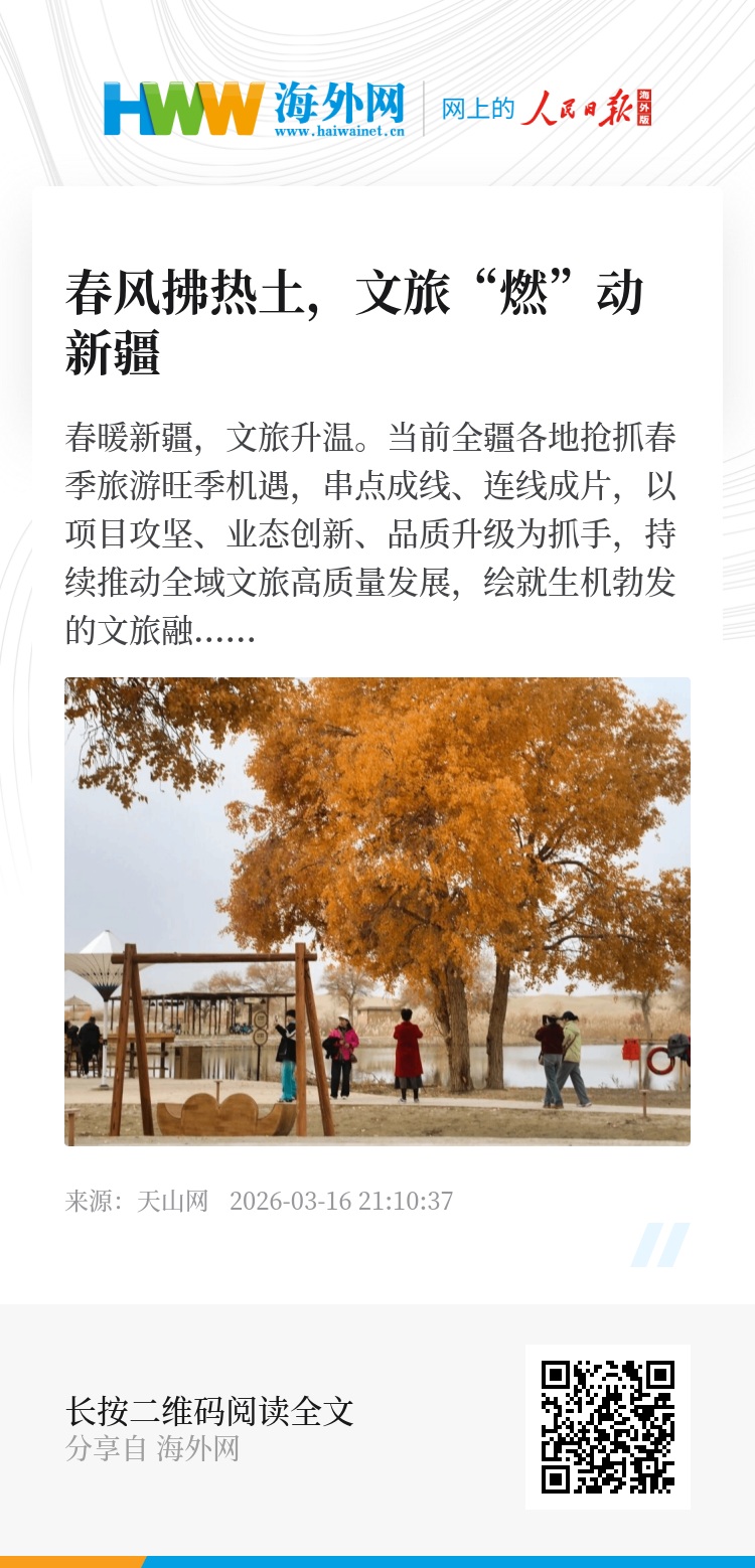 放眼全疆,各地州均紧扣春季文旅消费风口,因地制宜推出特色产品、完善服务配套、创新文旅业态,以多点发力、全域联动的态势,推动新疆文旅产业提质增效,让春日文旅热潮持续释放消费潜力,筑牢全年旅游高质量发展根基。(天山网-新疆日报记者 姚刚)