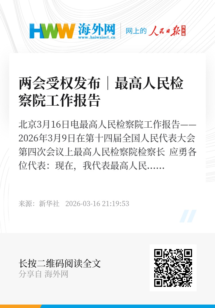 各位代表,2025年“十四五”圆满收官,党和国家事业取得新的重大成就。“十四五”时期,党中央高度重视检察工作,制发《中共中央关于加强新时代检察机关法律监督工作的意见》,引领人民检察事业稳步向前。检察工作取得的发展进步,根本在于以习近平同志为核心的党中央领航掌舵,在于习近平新时代中国特色社会主义思想科学指引,也是全国人大及其常委会有力监督、国务院大力支持、全国政协民主监督,国家监察委员会、最高人民法院配合与制约,各民主党派、工商联和无党派人士、各人民团体热忱关心,地方各级党政机关、各位代表、各位委员和社会各界支持帮助的结果。我谨代表最高人民检察院表示衷心感谢!