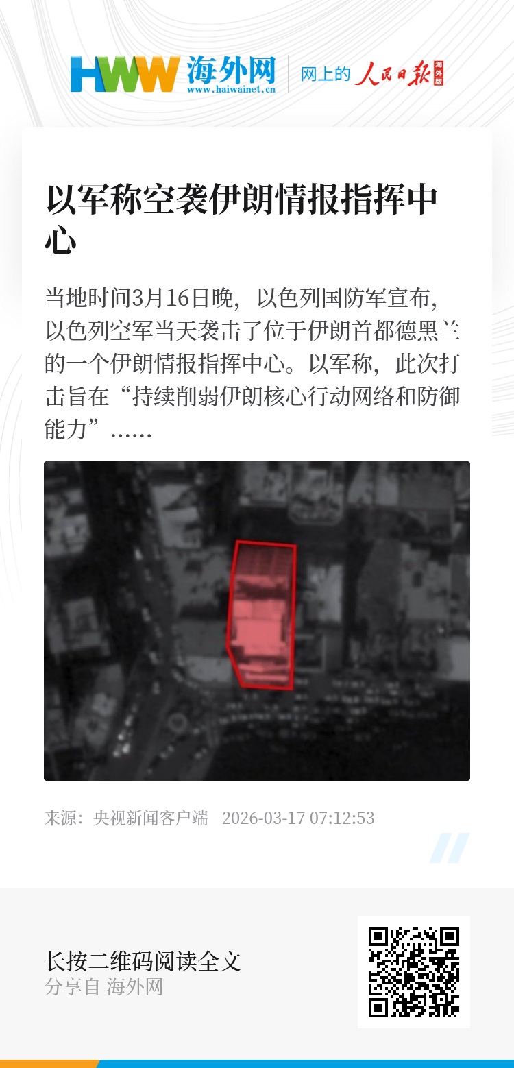 当地时间3月16日晚,以色列国防军宣布,以色列空军当天袭击了位于伊朗首都德黑兰的一个伊朗情报指挥中心。