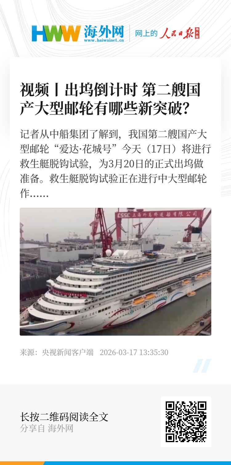 记者从中船集团了解到,我国第二艘国产大型邮轮“爱达·花城号”今天(17日)将进行救生艇脱钩试验,为3月20日的正式出坞做准备。
