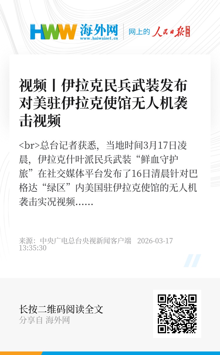 总台记者获悉,当地时间3月17日凌晨,伊拉克什叶派民兵武装“鲜血守护旅”在社交媒体平台发布了16日清晨针对巴格达“绿区”内美国驻伊拉克使馆的无人机袭击实况视频。