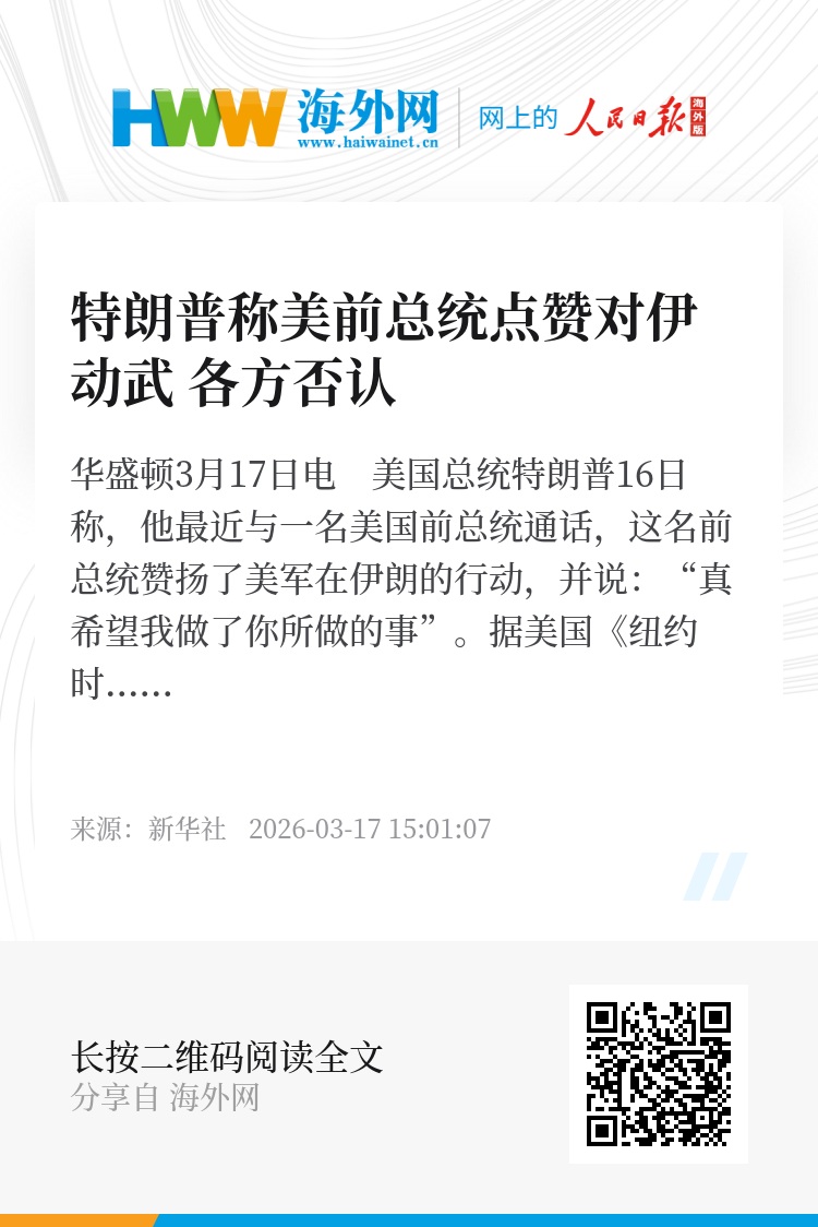 新华社华盛顿3月17日电 美国总统特朗普16日称,他最近与一名美国前总统通话,这名前总统赞扬了美军在伊朗的行动,并说:“真希望我做了你所做的事”。
