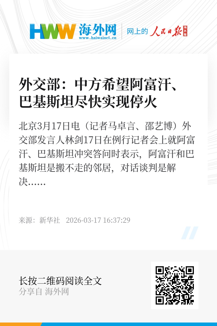 新华社北京3月17日电(记者马卓言、邵艺博)外交部发言人林剑17日在例行记者会上就阿富汗、巴基斯坦冲突答问时表示,阿富汗和巴基斯坦是搬不走的邻居,对话谈判是解决两国间问题的唯一有效途径。中方希望双方保持冷静克制,尽早面对面交流,尽快实现停火,通过对话解决矛盾分歧。中方已敦促阿巴两国确保中方的人员、项目和机构安全,将继续通过自身的渠道为缓局降温、两国改善关系发挥建设性作用。