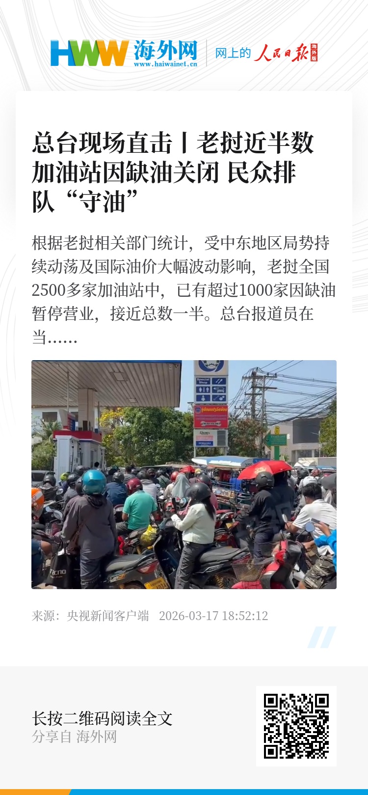 根据老挝相关部门统计,受中东地区局势持续动荡及国际油价大幅波动影响,老挝全国2500多家加油站中,已有超过1000家因缺油暂停营业,接近总数一半。