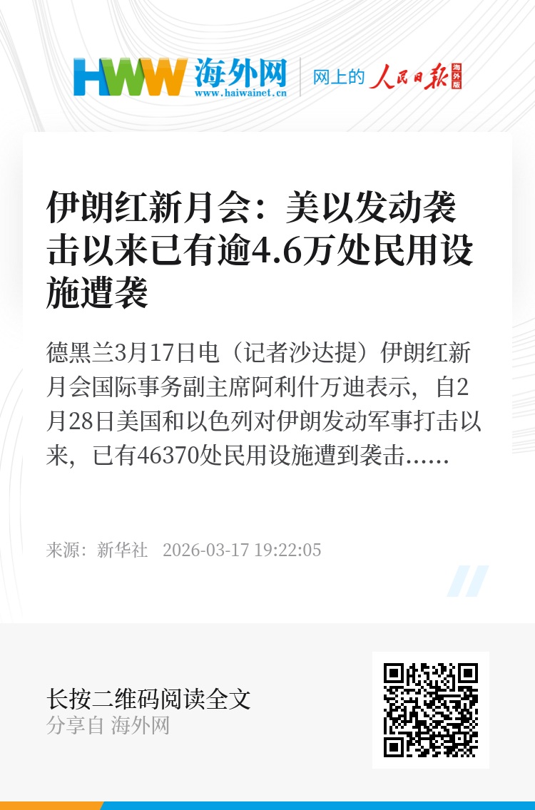 新华社德黑兰3月17日电(记者沙达提)伊朗红新月会国际事务副主席阿利什万迪表示,自2月28日美国和以色列对伊朗发动军事打击以来,已有46370处民用设施遭到袭击。