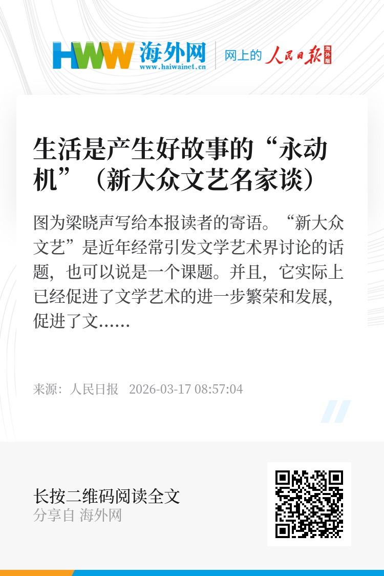 为了助推新大众文艺的活力,中国作家协会与抖音平台联袂,面向大众发起了“春节写作大赛”。我作为终评评委之一,认真阅读了30多篇进入终评环节的稿件。我又一次感到,在我们中国的大众之中,或曰在民间,储蓄着特别广泛也特别富有热忱的写作原动力。此种原动力进一步证明——文学之源亦在民间,在大众的生活之中。
