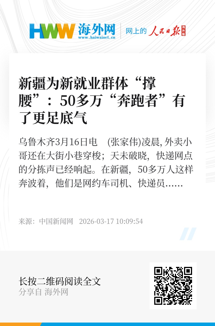 中新网乌鲁木齐3月16日电 (张家伟)凌晨,外卖小哥还在大街小巷穿梭;天未破晓,快递网点的分拣声已经响起。在新疆,50多万人这样奔波着,他们是网约车司机、快递员、网约配送员、自媒体从业者等新就业群体,活跃在寄递物流、同城配送、生活服务各个领域。