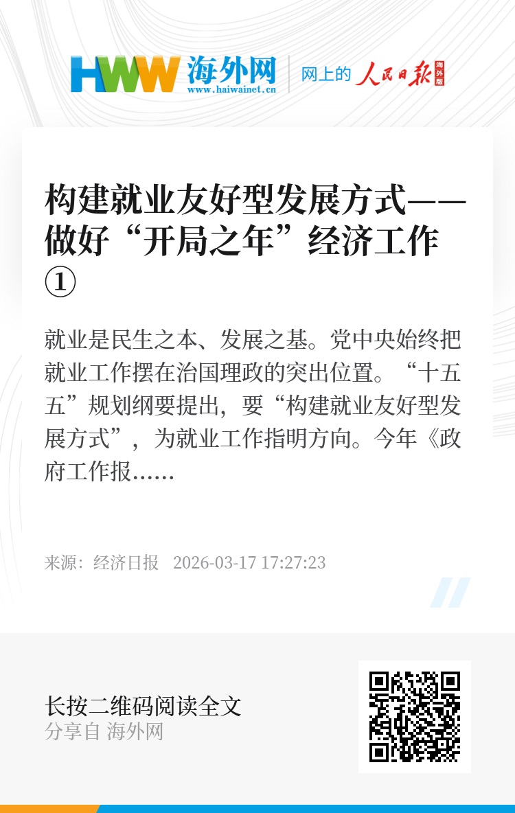就业是民生之本、发展之基。党中央始终把就业工作摆在治国理政的突出位置。“十五五”规划纲要提出,要“构建就业友好型发展方式”,为就业工作指明方向。今年《政府工作报告》明确就业预期目标,对促进高质量充分就业作出系统部署。其中,构建就业友好型发展方式是重点任务之一,也是实现高质量充分就业的关键抓手。