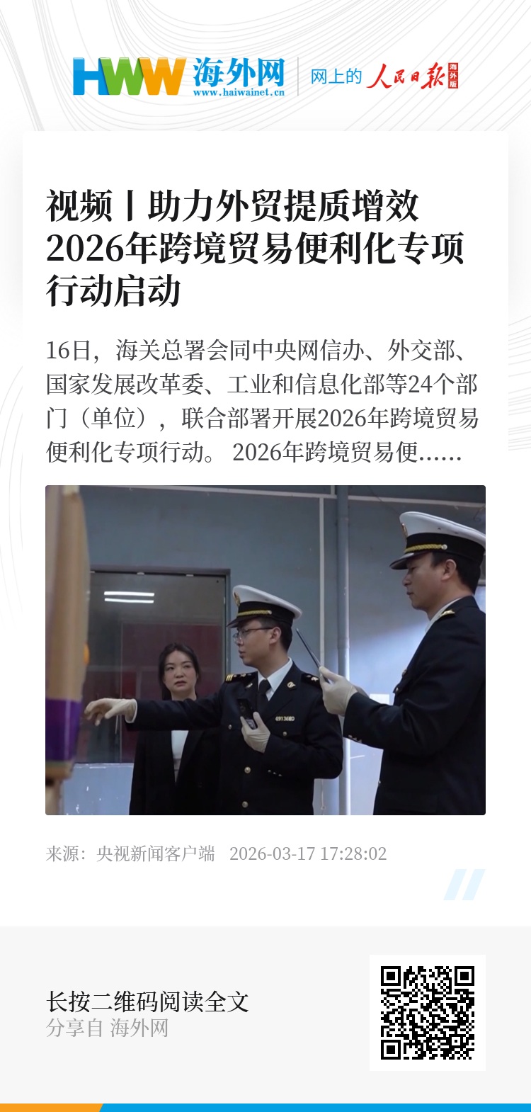 16日,海关总署会同中央网信办、外交部、国家发展改革委、工业和信息化部等24个部门(单位),联合部署开展2026年跨境贸易便利化专项行动。