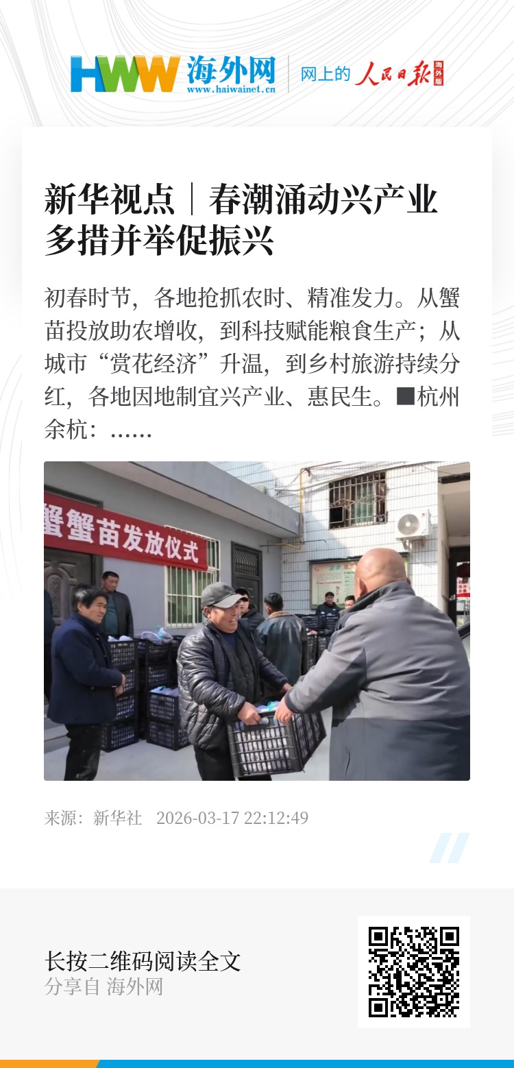 初春时节,各地抢抓农时、精准发力。从蟹苗投放助农增收,到科技赋能粮食生产;从城市“赏花经济”升温,到乡村旅游持续分红,各地因地制宜兴产业、惠民生。