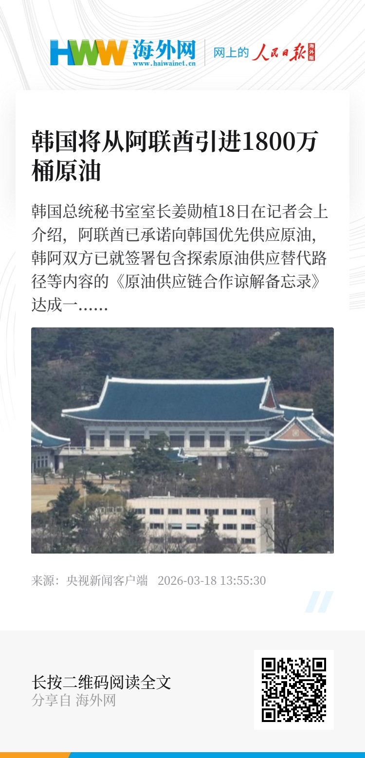 韩国总统秘书室室长姜勋植18日在记者会上介绍,阿联酋已承诺向韩国优先供应原油,韩阿双方已就签署包含探索原油供应替代路径等内容的《原油供应链合作谅解备忘录》达成一致,预计将于近期签署。