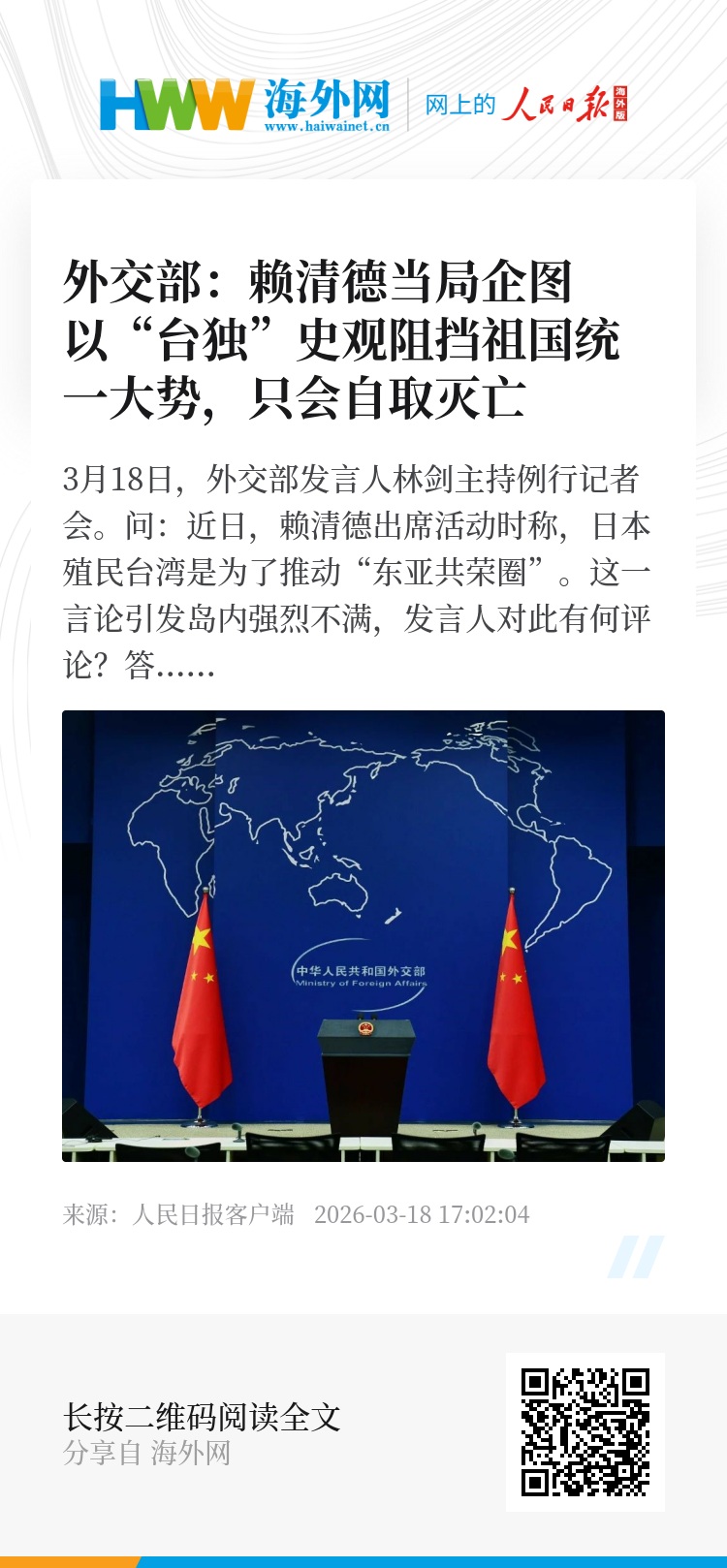 问:近日,赖清德出席活动时称,日本殖民台湾是为了推动“东亚共荣圈”。这一言论引发岛内强烈不满,发言人对此有何评论?