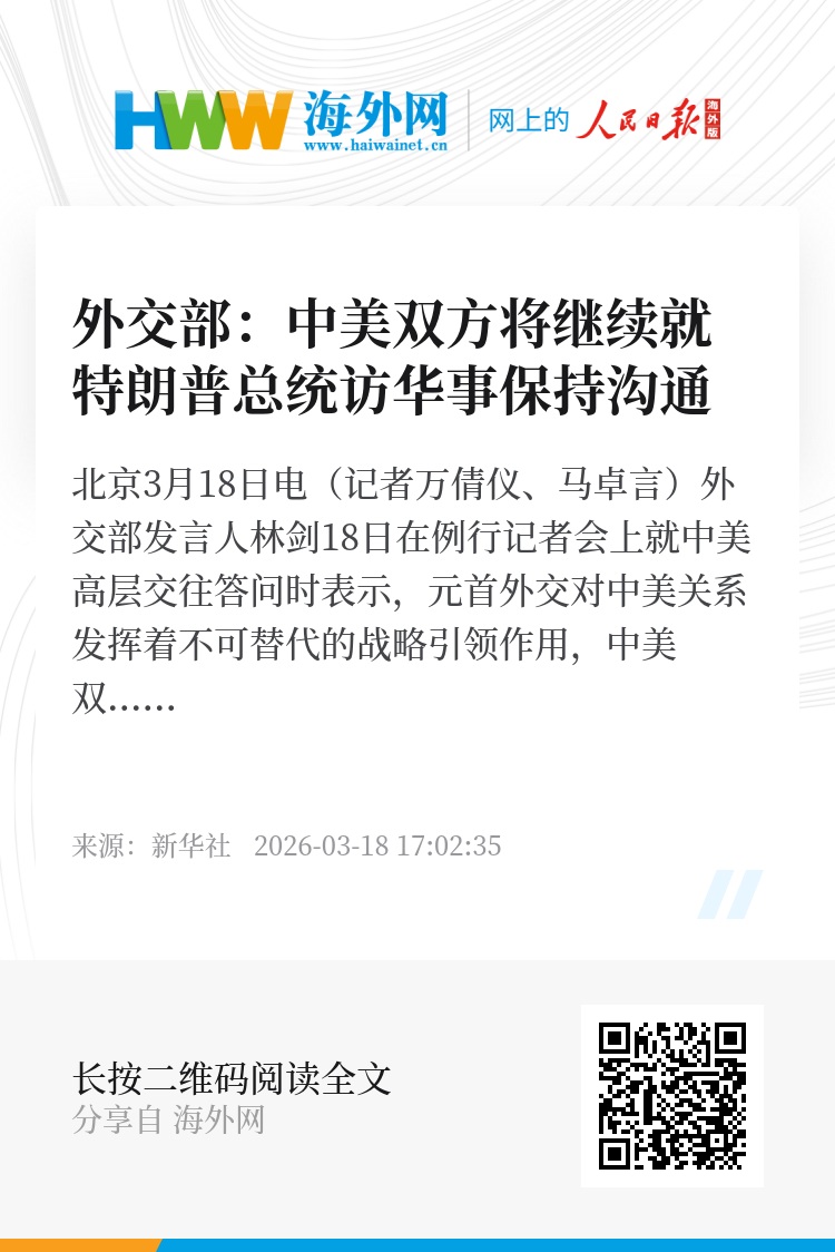 新华社北京3月18日电(记者万倩仪、马卓言)外交部发言人林剑18日在例行记者会上就中美高层交往答问时表示,元首外交对中美关系发挥着不可替代的战略引领作用,中美双方将继续就特朗普总统访华事保持沟通。