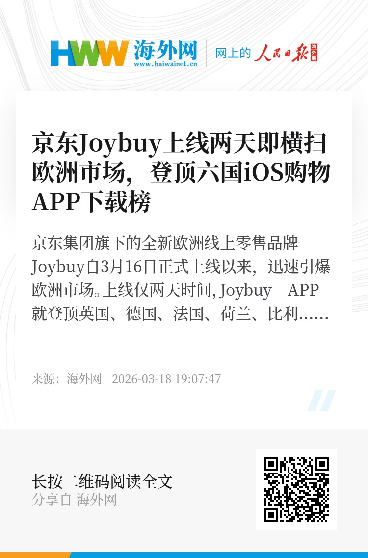 京东集团旗下的全新欧洲线上零售品牌Joybuy自3月16日正式上线以来,迅速引爆欧洲市场。上线仅两天时间,Joybuy APP就登顶英国、德国、法国、荷兰、比利时和卢森堡六个国家的iOS购物APP榜单。