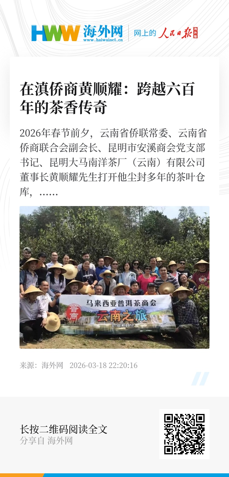 2026年春节前夕,云南省侨联常委、云南省侨商联合会副会长、昆明市安溪商会党支部书记、昆明大马南洋茶厂(云南)有限公司董事长黄顺耀先生打开他尘封多年的茶叶仓库,一款压制紧实的普洱茶饼静静陈列在展柜中。在深褐色的茶饼包装上,印着“郑和下西洋600周年·中马邦交纪念”的字样,虽已有些许磨损,却在时光浸润下更显厚重。他说,这款诞生于2004年的纪念茶历经二十载陈化,如今已成为兼具历史意义与品饮价值的老生茶,其背后流转的故事,恰似一段跨越六百年的丝路茶香传奇,见证了中马邦交的丝路情谊。