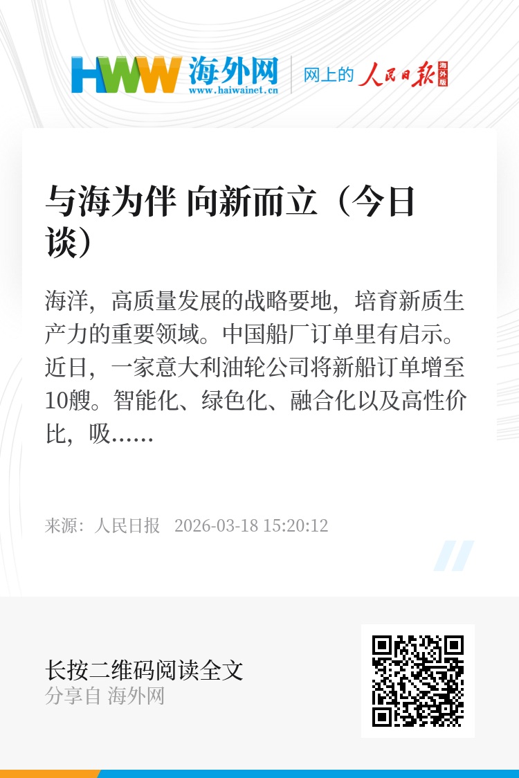 中国船厂订单里有启示。近日,一家意大利油轮公司将新船订单增至10艘。智能化、绿色化、融合化以及高性价比,吸引海外订单纷至沓来,我国造船业市场份额保持全球第一。