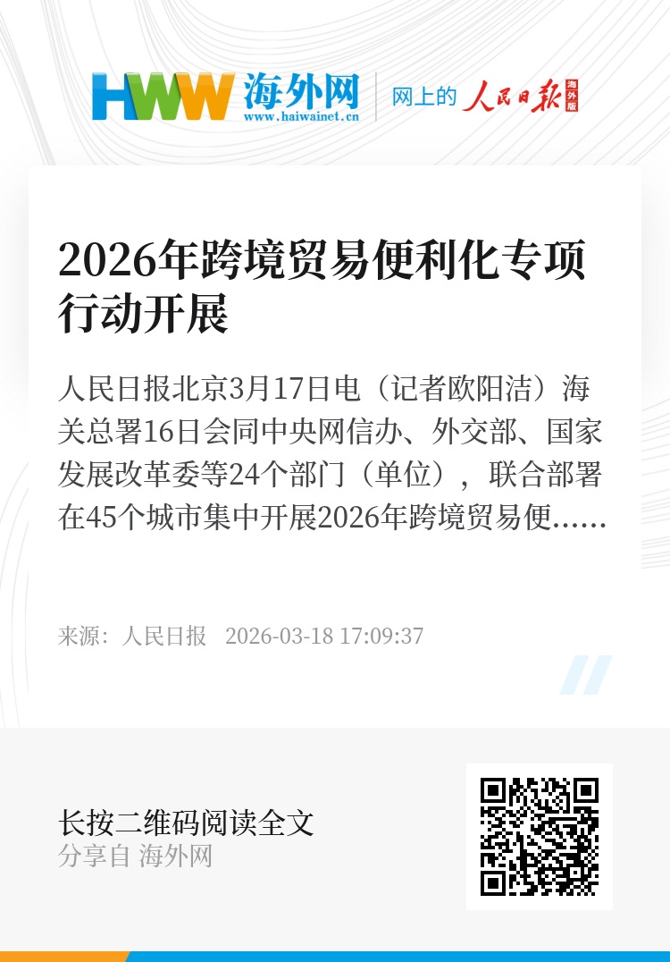 人民日报北京3月17日电(记者欧阳洁)海关总署16日会同中央网信办、外交部、国家发展改革委等24个部门(单位),联合部署在45个城市集中开展2026年跨境贸易便利化专项行动。