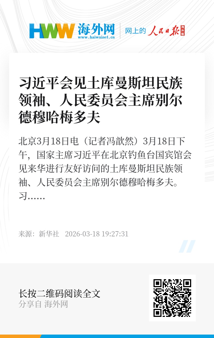 新华社北京3月18日电(记者冯歆然)3月18日下午,国家主席习近平在北京钓鱼台国宾馆会见来华进行友好访问的土库曼斯坦民族领袖、人民委员会主席别尔德穆哈梅多夫。