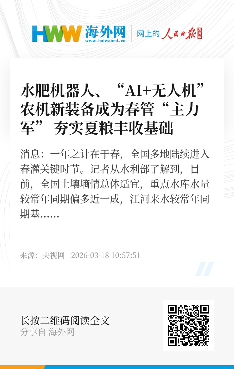 走进周口市商水县的高标准农田,绿油油的麦苗如同给大地铺上一层地毯,生机勃勃。随着一声声指令,不远处的喷枪喷出长长的水柱开始为小麦浇水施肥。种植户告诉记者,智控水肥机器人植入了AI功能,能够实时监测田间环境数据并自主决策水量大小和肥料多少,既让麦苗“喝得饱”又能“吃得好”。除了智控水肥机器人,植保无人机也成为春管的“主力军”。在周口市淮阳区王店乡路楼村的麦田里,农技人员正借助无人机喷洒叶面肥。