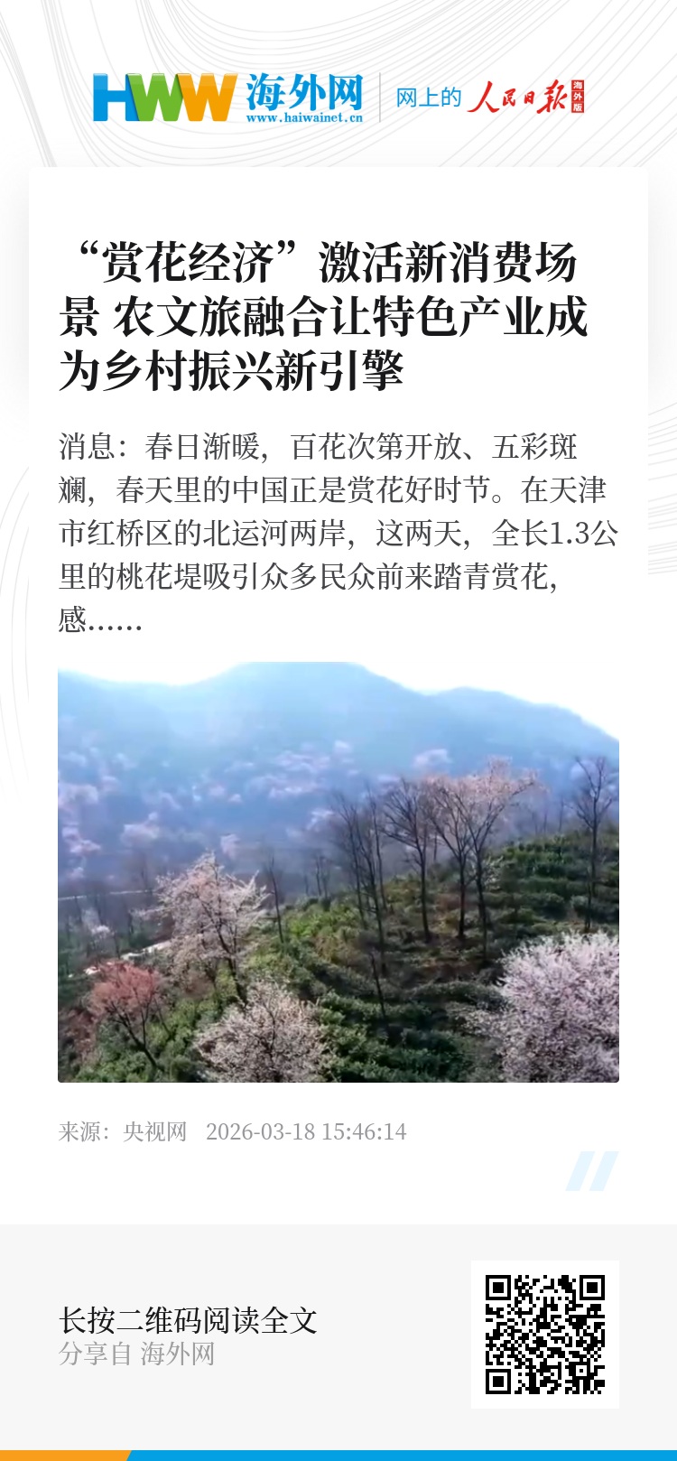 为方便市民游客出行,今年,当地还特意开通了免费定制公交专线,串联起桃花堤、西沽公园等主要游览点位,打通赏花出行“最后一公里”。根据测算,仅上个周末2天,就有超22万人次游客慕名而来。春日正好,也欢迎您来天津共赏烂漫的春日好风光。