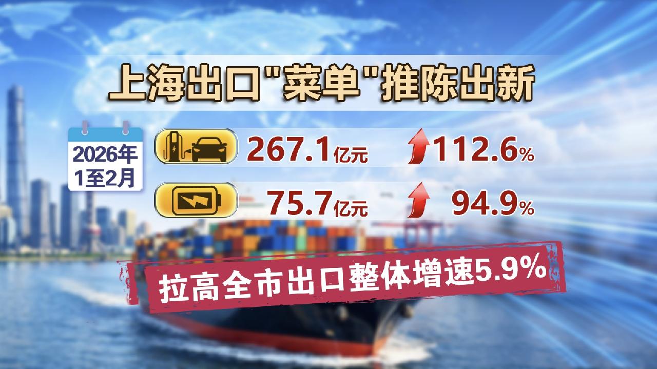 那上海带给全球市场哪些好产品呢?总结一下关键词,那就是以高技术、绿色化为代表的新动能产品。前2个月,电动汽车、锂电池的出口增速一个涨了一倍多、另一个涨了九成五。仅这两项就拉高全市出口整体增速5.9个百分点。