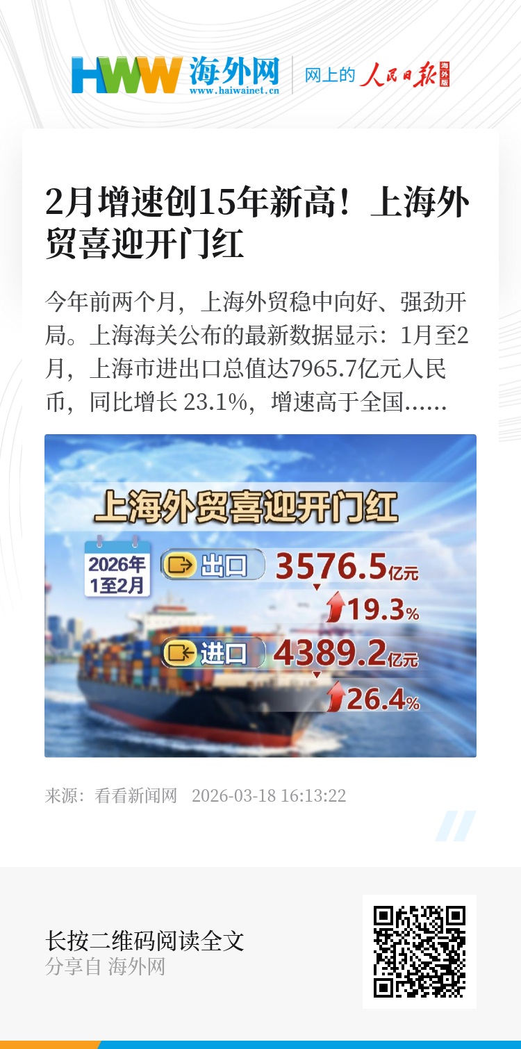 今年前2个月,上海市出口3576.5亿元,增长19.3%;进口4389.2亿元,增长26.4%。