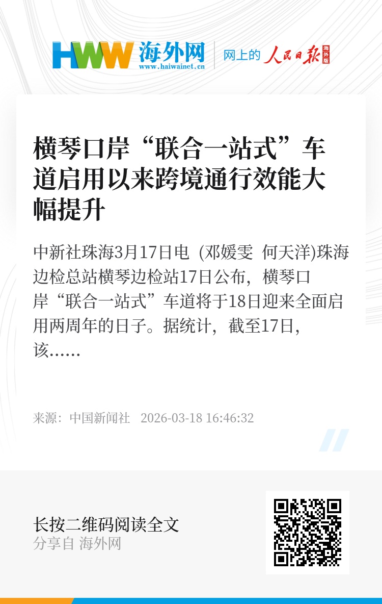 中新社珠海3月17日电 (邓媛雯 何天洋)珠海边检总站横琴边检站17日公布,横琴口岸“联合一站式”车道将于18日迎来全面启用两周年的日子。据统计,截至17日,该站依托全国首创的车辆“合作查验、一次放行”创新模式,持续优化通关服务、提升查验效能,累计查验出入境车辆637万辆次,同比增长89%,其中澳门单牌车超420万辆次,占车流总量的65.9%,是琴澳跨境车流的主力。