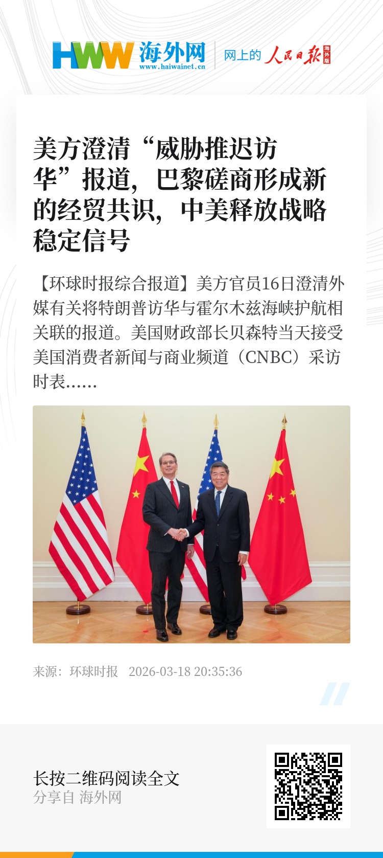 【环球时报综合报道】美方官员16日澄清外媒有关将特朗普访华与霍尔木兹海峡护航相关联的报道。美国财政部长贝森特当天接受美国消费者新闻与商业频道(CNBC)采访时表示,有关报道完全错误,如果特朗普总统同中国领导人会晤延期,那将是后勤方面的原因,特朗普总统希望留在华盛顿协调战争事务,在这种时候出访可能不是最佳选择。特朗普16日下午在白宫表示,虽然他希望访问中国,但“因为伊朗战争,我想留在这里,我觉得我必须留在这里”,他计划将原定于3月下旬进行的对华访问推迟约一个月。他同时强调与中方有着“非常好的关系”。中国外交部发言人林剑17日在回答相关问题时表示,中美双方就特朗普总统访华时间等问题保持着沟通,目前没有可以进一步提供的信息。此前一天,中美双方团队结束在法国巴黎举行的经贸磋商,就一些议题取得初步共识。新加坡《联合早报》称,中美第六轮经贸磋商释放积极信号,双方均形容此次磋商富有“建设性”,两国都希望维持稳定经贸关系。