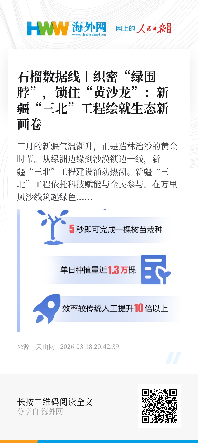 新疆“三北”工程依托科技赋能与全民参与,在万里风沙线筑起绿色屏障。通过生态治理与产业深度融合,让荒漠焕发生机、群众增收致富。这不仅是筑牢国家生态安全屏障的坚实举措,更是书写人与自然和谐共生的新疆篇章。