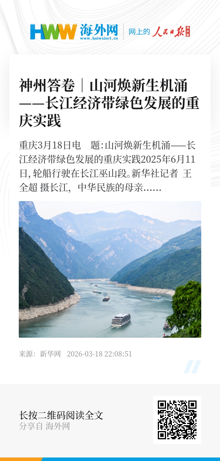 新华网重庆3月18日电 题:山河焕新生机涌——长江经济带绿色发展的重庆实践
