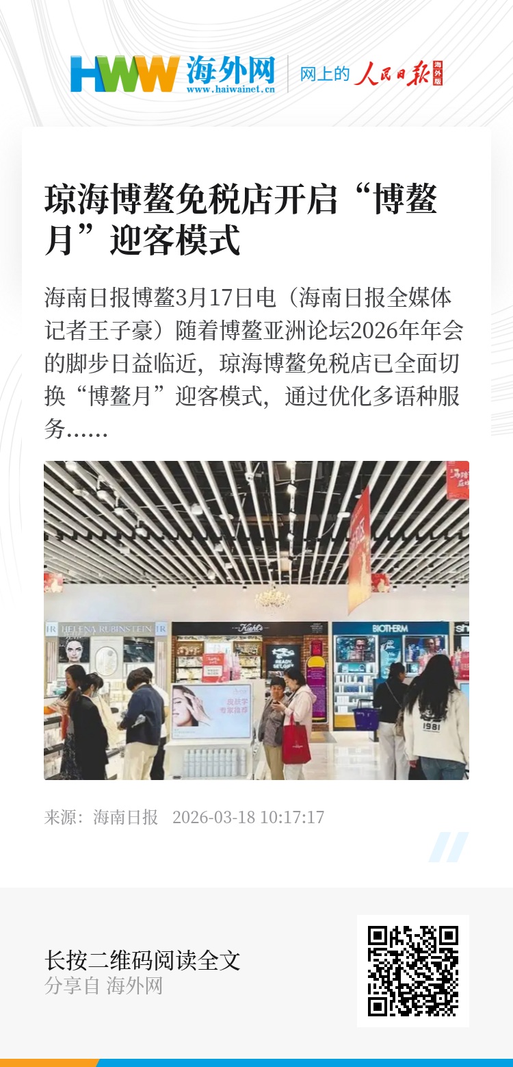海南日报博鳌3月17日电(海南日报全媒体记者王子豪)随着博鳌亚洲论坛2026年年会的脚步日益临近,琼海博鳌免税店已全面切换“博鳌月”迎客模式,通过优化多语种服务及外卡支付、开展多重促销活动等多项举措,全力为国际盛会预热蓄能,以最佳姿态迎接中外宾客。
