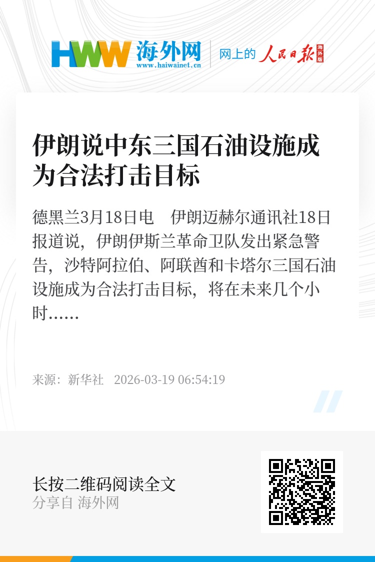 新华社德黑兰3月18日电 伊朗迈赫尔通讯社18日报道说,伊朗伊斯兰革命卫队发出紧急警告,沙特阿拉伯、阿联酋和卡塔尔三国石油设施成为合法打击目标,将在未来几个小时内进行打击,敦促相关区域民众撤离。