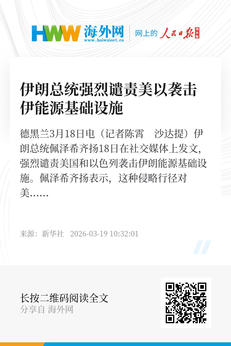 新华社德黑兰3月18日电(记者陈霄 沙达提)伊朗总统佩泽希齐扬18日在社交媒体上发文,强烈谴责美国和以色列袭击伊朗能源基础设施。