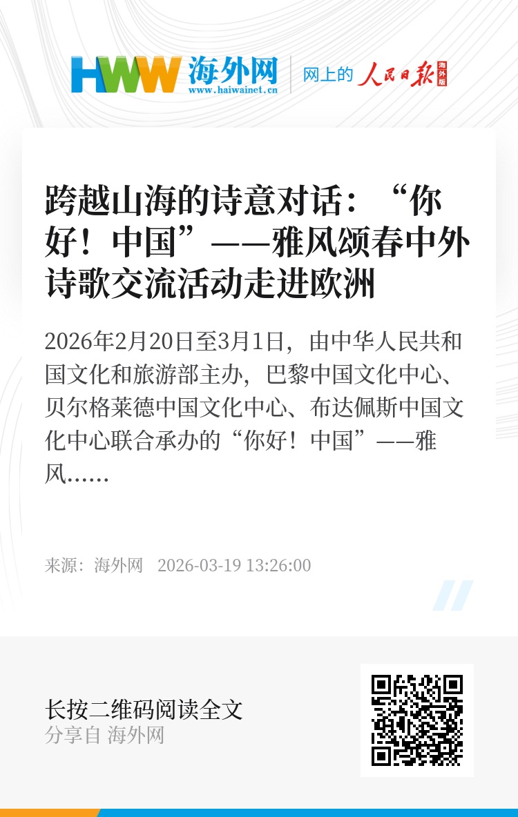 2026年2月20日至3月1日,由中华人民共和国文化和旅游部主办,巴黎中国文化中心、贝尔格莱德中国文化中心、布达佩斯中国文化中心联合承办的“你好!中国”——雅风颂春中外诗歌交流活动,在法国巴黎、塞尔维亚贝尔格莱德、匈牙利布达佩斯三地先后拉开帷幕。