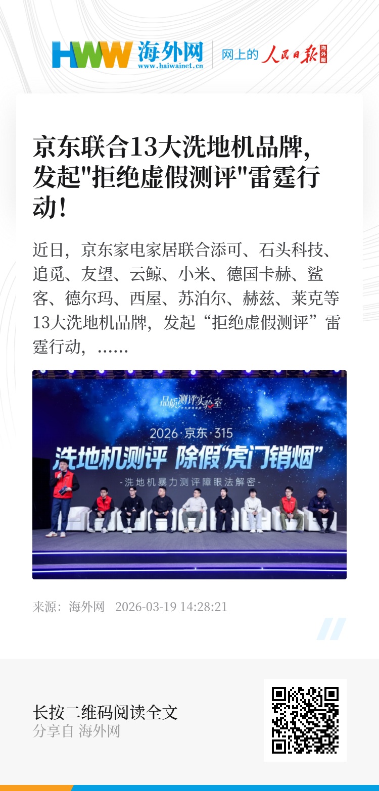 京东联合13大洗地机品牌共同抵制虚假评测行业乱象,不仅是一次正面回应,更是在推动洗地机行业重新厘清“测评”与“营销”的边界,促使行业竞争回到产品能力、技术创新和使用体验本身。京东希望与品牌共同推动测评内容回归真实、消费决策回归理性、行业竞争回归有序,持续助力洗地机行业朝着更加透明、规范、健康的方向发展。