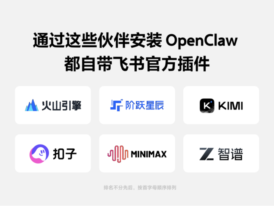 面向工程师,飞书开源并持续升级官方OpenClaw插件。该插件支持OpenClaw以用户身份操作云文档、多维表格及日程,实现与飞书工作流的深度融合。目前,火山引擎、阶跃星辰、Kimi、扣子、MiniMax、智谱等主流大模型与云服务厂商均已完成与飞书官方插件的对接。
