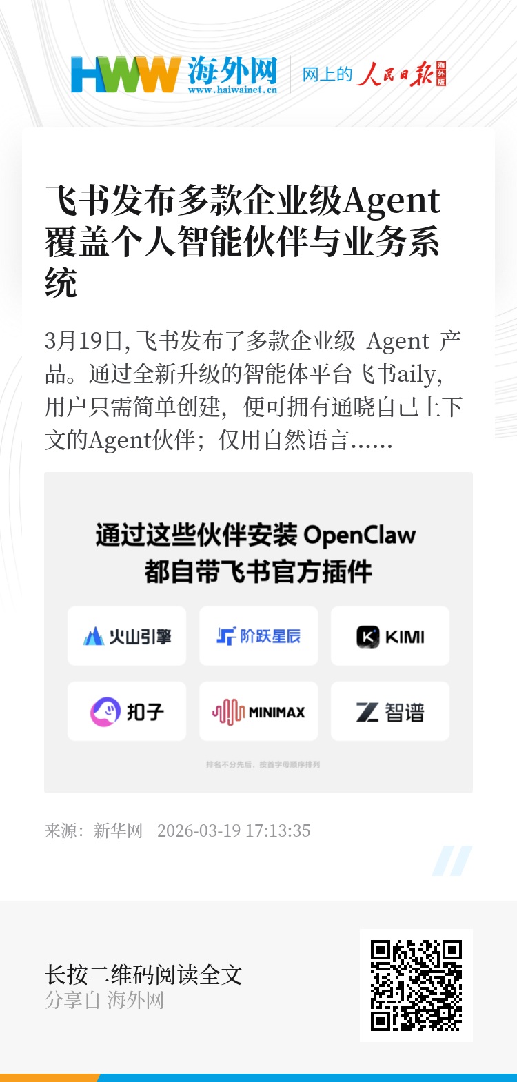 此外,飞书还推出OpenClaw官方插件与一键部署等多项Agent友好能力。飞书CEO谢欣表示:“OpenClaw的火爆开启了Agent应用的全新时代。如何让每个人都能简单、安全地拥有像‘龙虾’一样的 Agent 能力,是飞书首要解决的问题。我们希望在今年,让每个人都拥有自己的智能工作伙伴。”