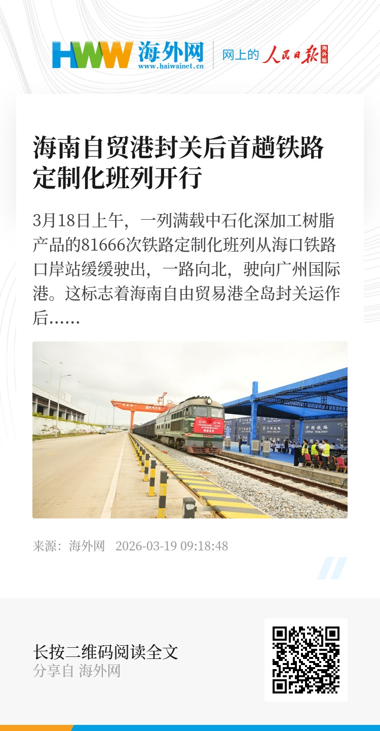 3月18日上午,一列满载中石化深加工树脂产品的81666次铁路定制化班列从海口铁路口岸站缓缓驶出,一路向北,驶向广州国际港。这标志着海南自由贸易港全岛封关运作后首趟铁路定制化班列成功开行,琼粤两地间再添一条高效、稳定、绿色的物流大通道。图源:视觉中国 石磊/摄