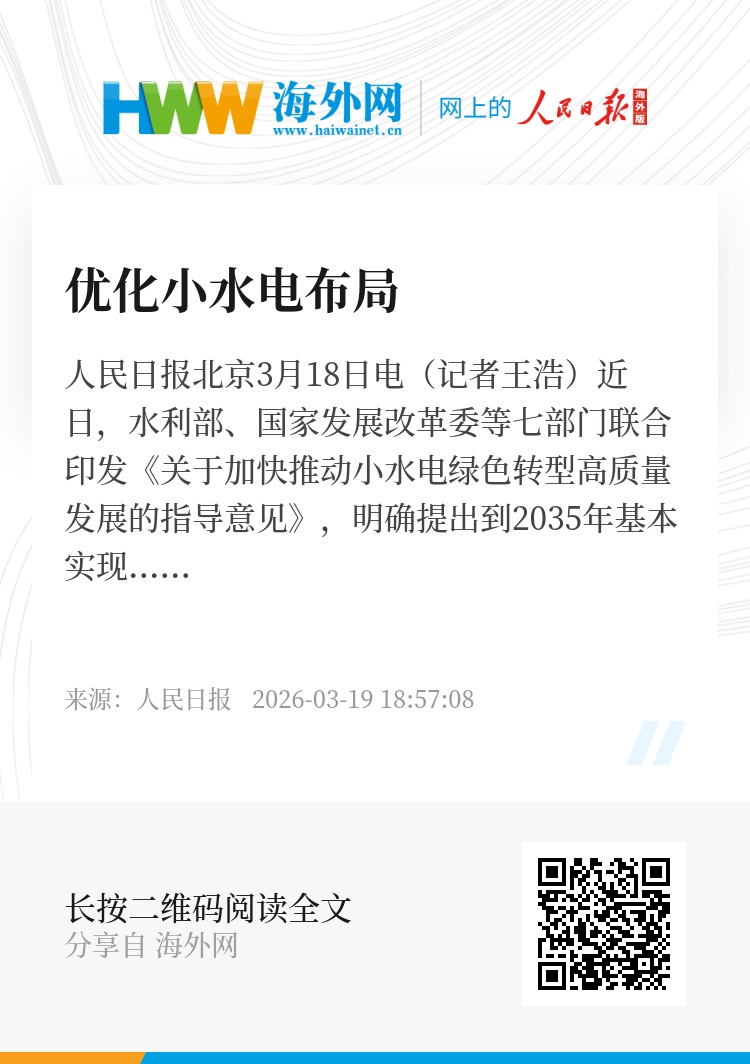 人民日报北京3月18日电(记者王浩)近日,水利部、国家发展改革委等七部门联合印发《关于加快推动小水电绿色转型高质量发展的指导意见》,明确提出到2035年基本实现电站智能化、集约化、标准化,形成与经济社会发展全面绿色转型相适应的小水电高质量发展格局。