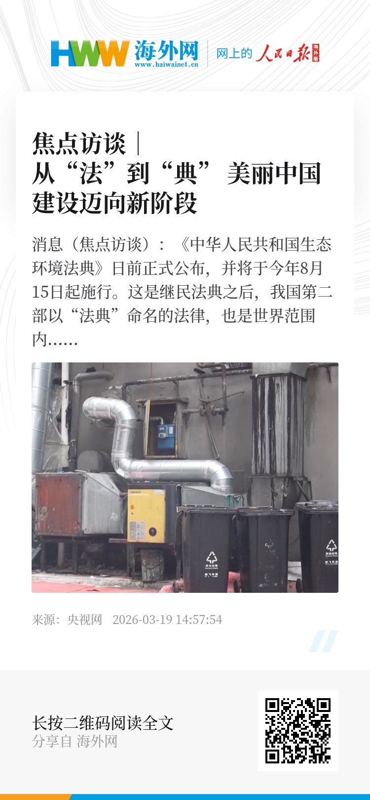 央视网消息(焦点访谈):《中华人民共和国生态环境法典》日前正式公布,并将于今年8月15日起施行。这是继民法典之后,我国第二部以“法典”命名的法律,也是世界范围内第一部以“生态环境”命名的综合性法典,标志着我国生态环境法治建设进入法典化新阶段。从“法”到“典”,承载着怎样的深意?它又和我们有什么样的关系?将如何重塑我们的生活,守护共同的家园?