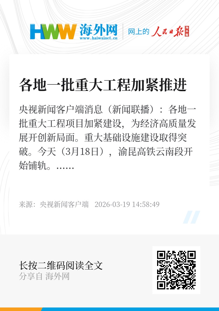 央视新闻客户端消息(新闻联播):各地一批重大工程项目加紧建设,为经济高质量发展开创新局面。