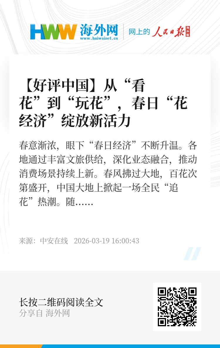 从看花到玩花,从打卡到沉浸,春日“花经济”正绽放全新活力。让鲜花绽放更多玩法、让赏花延伸更长产业链,关键在创新、在特色、在文化。各地跳出同质化造景,深挖地域特色与文化内涵,打造差异化IP,持续完善服务、优化体验,让一时花海变成长久产业,让这朵“经济之花”越开越鲜艳,为美好生活注入更多春光与力量。