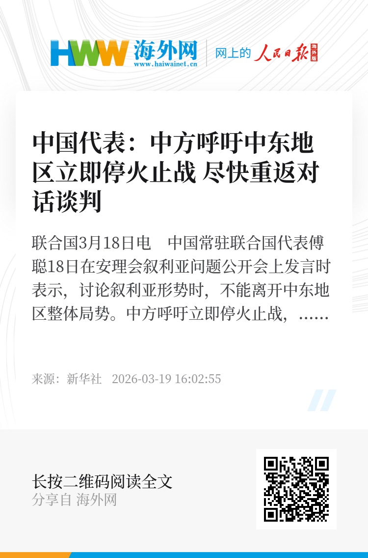 新华社联合国3月18日电 中国常驻联合国代表傅聪18日在安理会叙利亚问题公开会上发言时表示,讨论叙利亚形势时,不能离开中东地区整体局势。中方呼吁立即停火止战,防止战火进一步蔓延,尽快重返对话谈判。