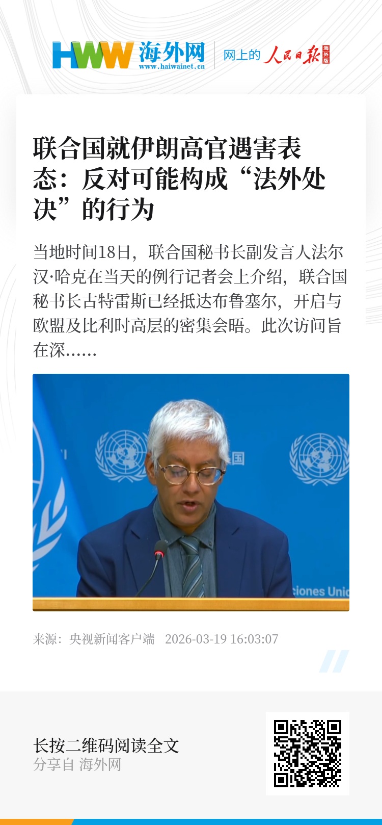 针对近期伊朗最高国家安全委员会秘书拉里贾尼及情报部长哈提卜遭以军空袭遇害一事,哈克表示,联合国原则上反对任何可能构成“法外处决”的行为,这一立场适用于所有此类事件。他强调,军事手段绝非解决争端的根本之道。联合国再次敦促美以伊等各方保持克制,避免冲突进一步升级,防止中东地区陷入更深重的危机。