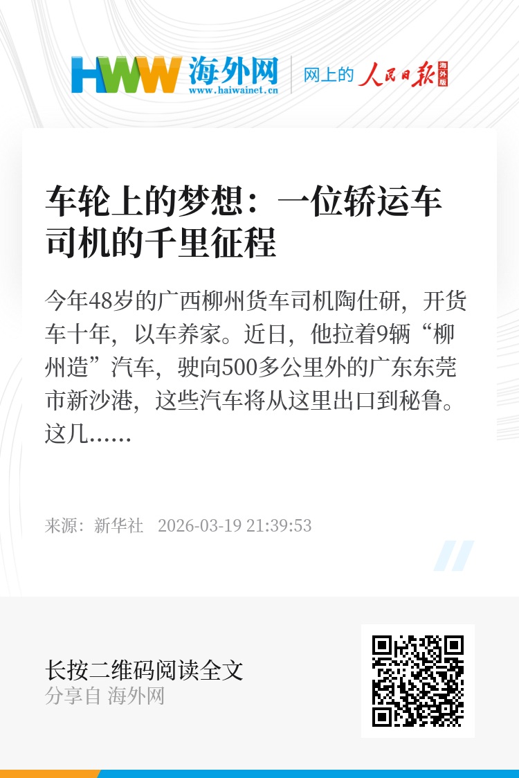 今年48岁的广西柳州货车司机陶仕研,开货车十年,以车养家。近日,他拉着9辆“柳州造”汽车,驶向500多公里外的广东东莞市新沙港,这些汽车将从这里出口到秘鲁。这几年,陶仕研服务的汽车生产企业提供的运输订单源源不断,他的收入渐渐稳定下来,车轮载着一家人的生计与期盼,稳稳地往前奔。