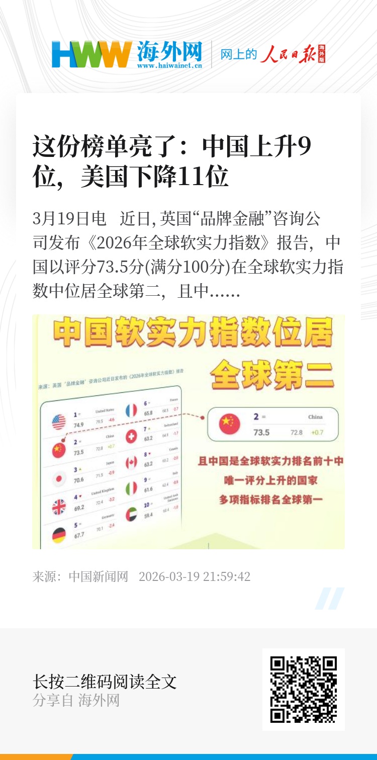 中新网3月19日电 近日,英国“品牌金融”咨询公司发布《2026年全球软实力指数》报告,中国以评分73.5分(满分100分)在全球软实力指数中位居全球第二,且中国是全球软实力排名前10中唯一评分上升的国家,多项指标排名全球第一。报告显示,美国是评分下降最多的国家。“美国优先”在国际社会引发强烈不满,导致美国在“声誉”这一衡量软实力的关键指标中下降11位。而中国的国际声誉排名则大幅上升,首次超越美国。